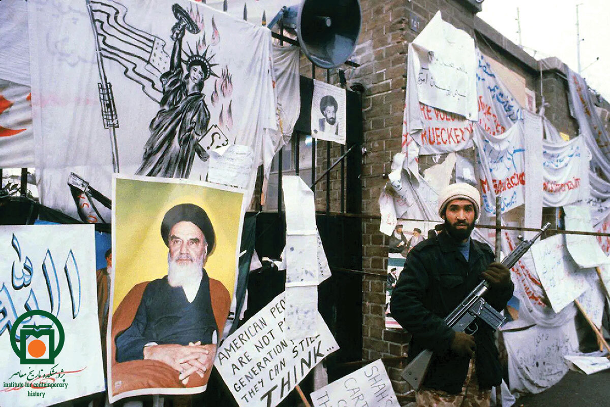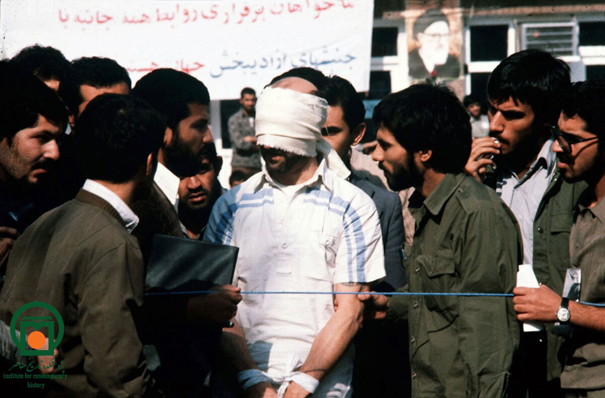 لحظات دستگیری کارکنان سفارت سابق آمریکا توسط دانشجویان پیرو خط امام. در تصویر تقی محمدی دیده میشود