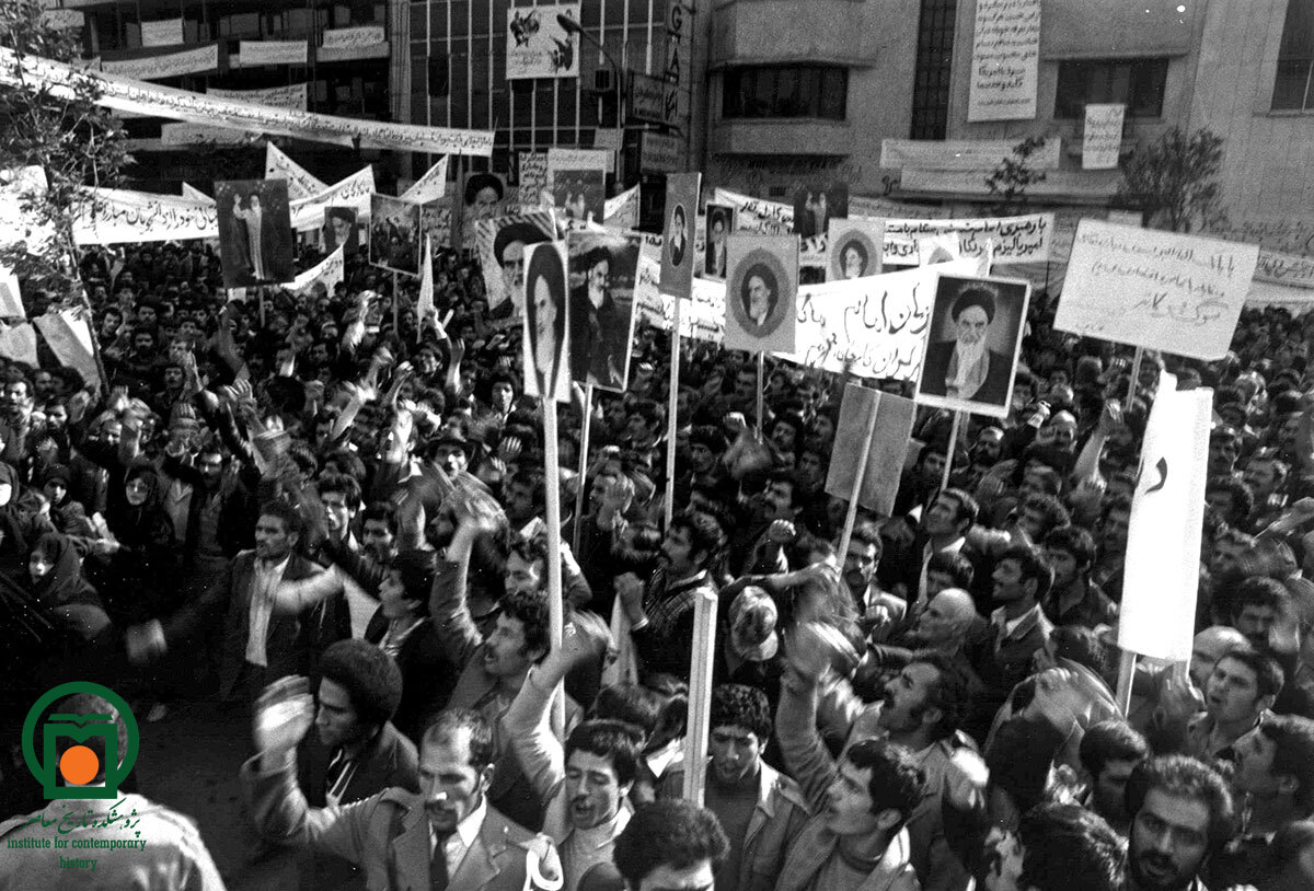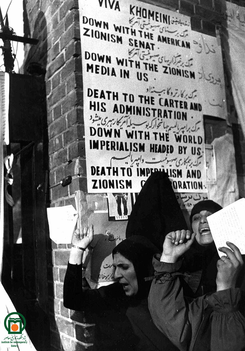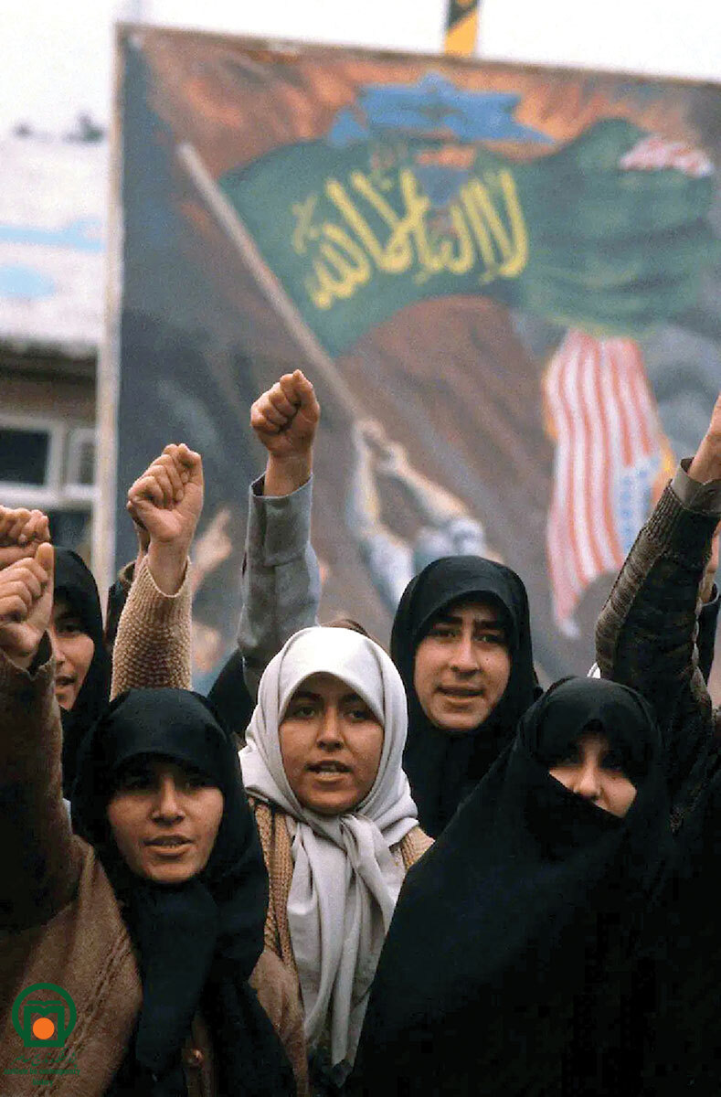 جمعی از دانشجویان پیرو خط امام در حال شعار دادن در محوطه لانه جاسوسی