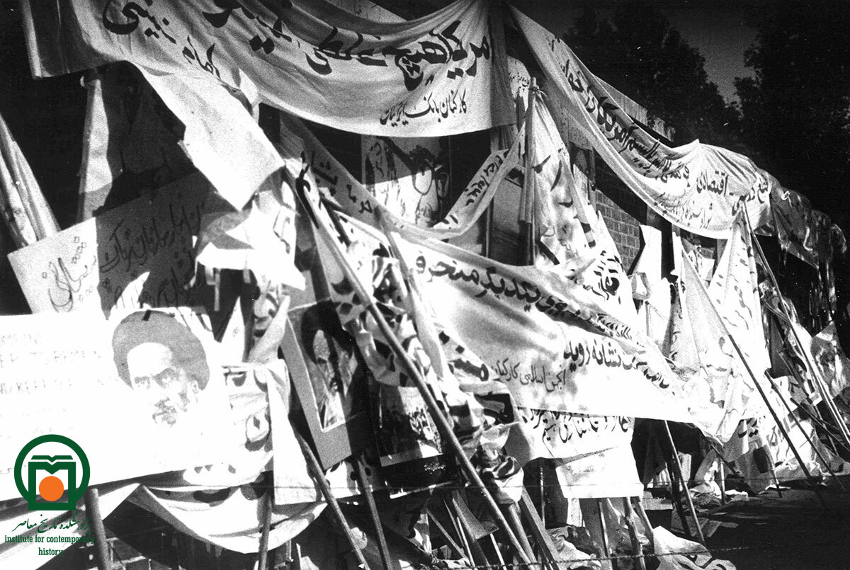 نمای از الصاق پلاکاردهای حمایت از تسخیر لانه جاسوسی آمریکا در بالای درب ورودی این مکان