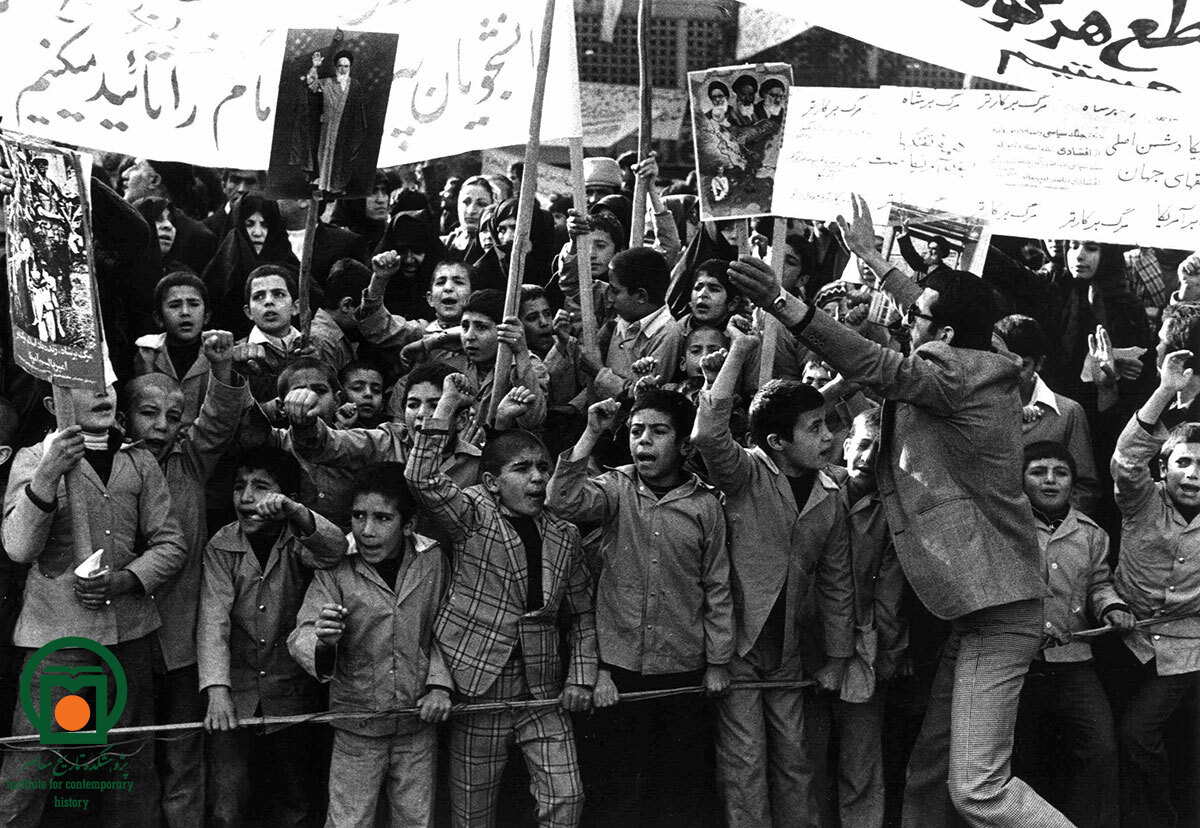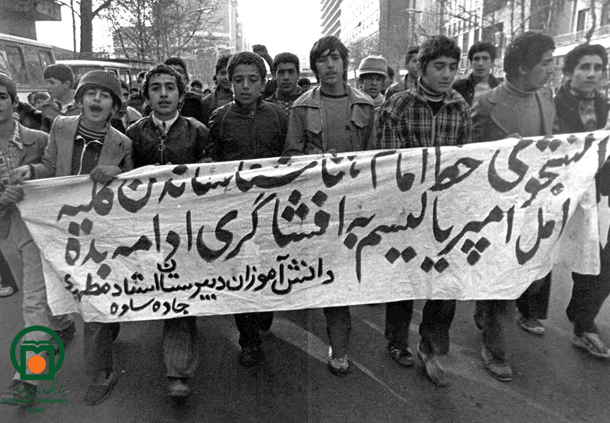 نمایی از راهپیمایی گروهی از دانشآموزان در برابر لانه جاسوسی آمریکا، در حمایت از دانشجویان پیرو خط امام