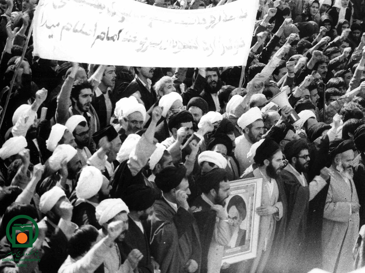 نمایی از راهپیمایی گروهی از روحانیون در برابر لانه جاسوسی آمریکا، در حمایت از دانشجویان پیرو خط امام