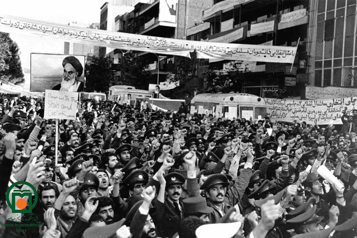 نمایی از راهپیمایی گروهی از نظامیان در برابر لانه جاسوسی آمریکا، در حمایت از دانشجویان پیرو خط امام