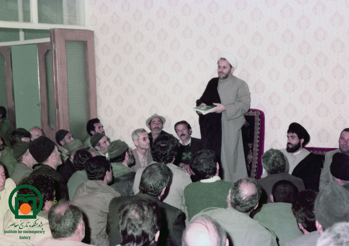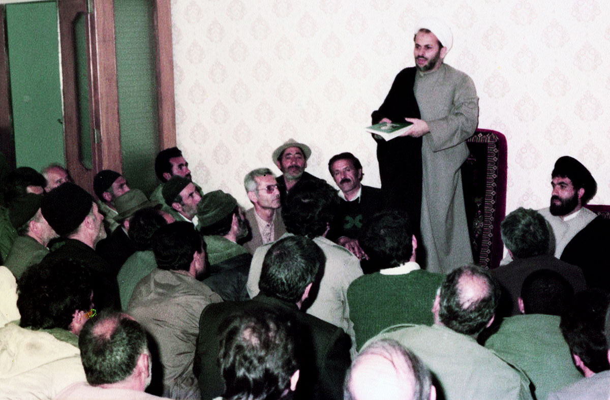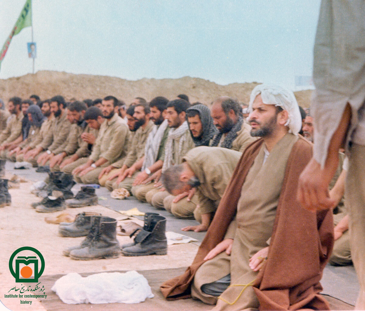زندهیاد حجتالاسلام والمسلمین جعفر شجونی در حال اقامه نماز جماعت در جبهههای جنگ (دهه 1360)