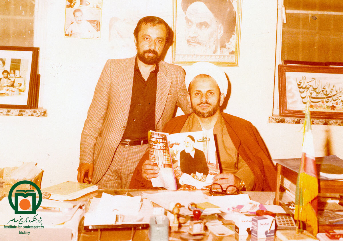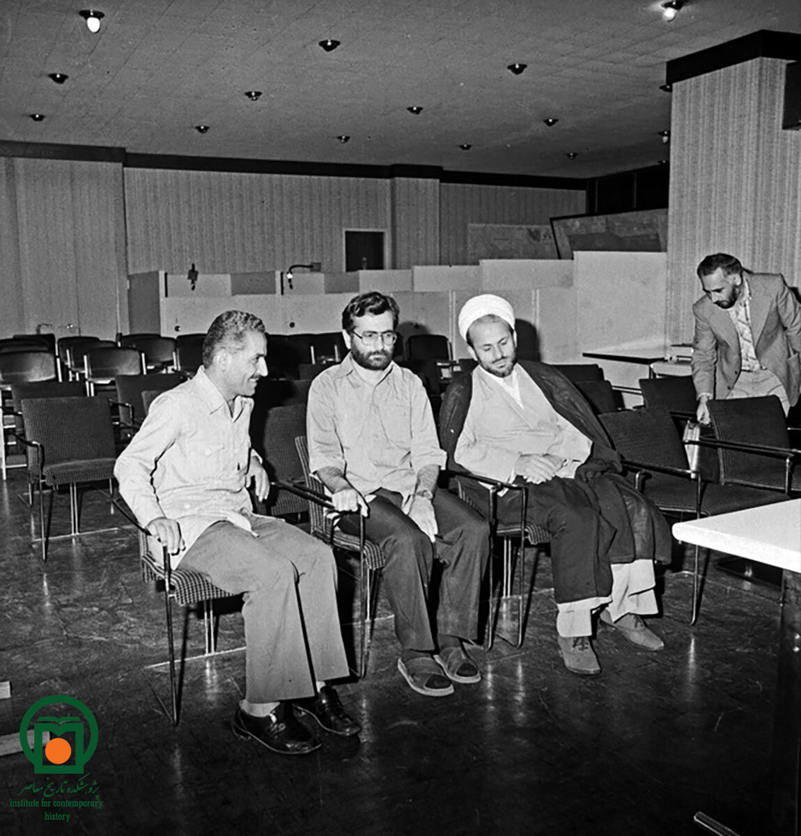زندهیاد حجتالاسلام والمسلمین جعفر شجونی در کنار شهید محمدعلی رجایی و دکتر کمال خرازی، در بازدید از خبرگزاری جمهوری اسلامی (سال 1359)