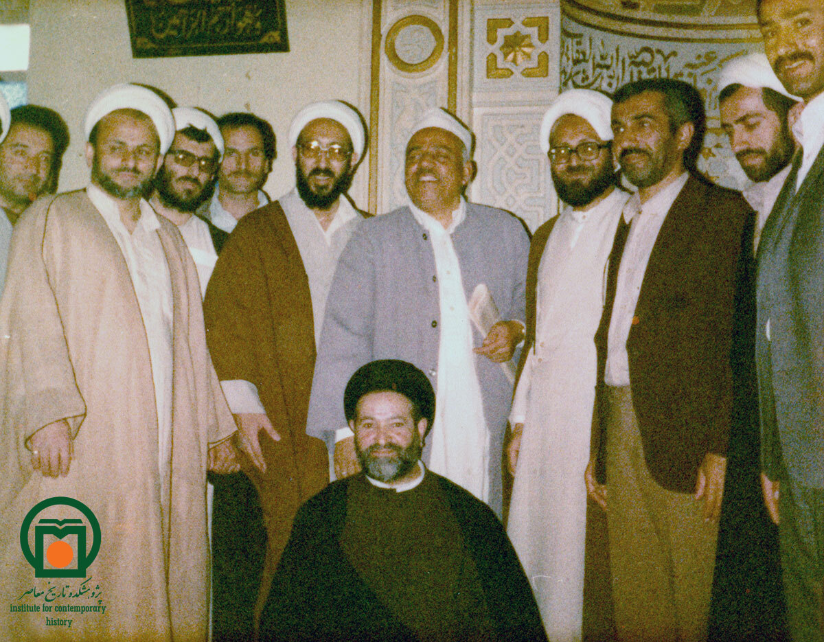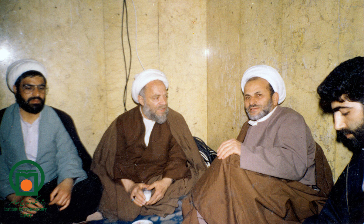 زندهیاد حجتالاسلام والمسلمین جعفر شجونی در کنار مرحومان حجج اسلام شیخ علیاصغر مروارید، شیخ ابوذر بیدار و جمعی از دوستان و اطرافیان (دهه 1360)