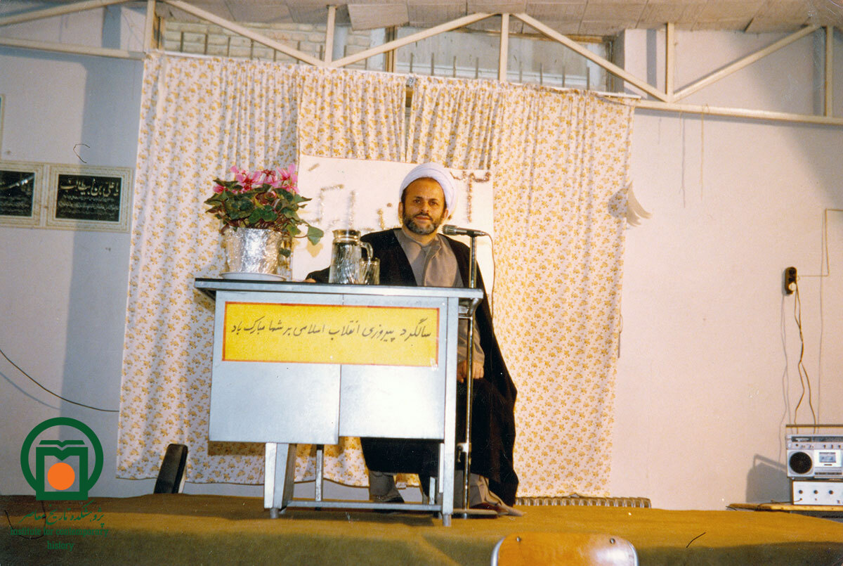 زندهیاد حجتالاسلام والمسلمین جعفر شجونی، در حال سخنرانی برای محصلین مدرسه فیاضبخش (دهه 1360)