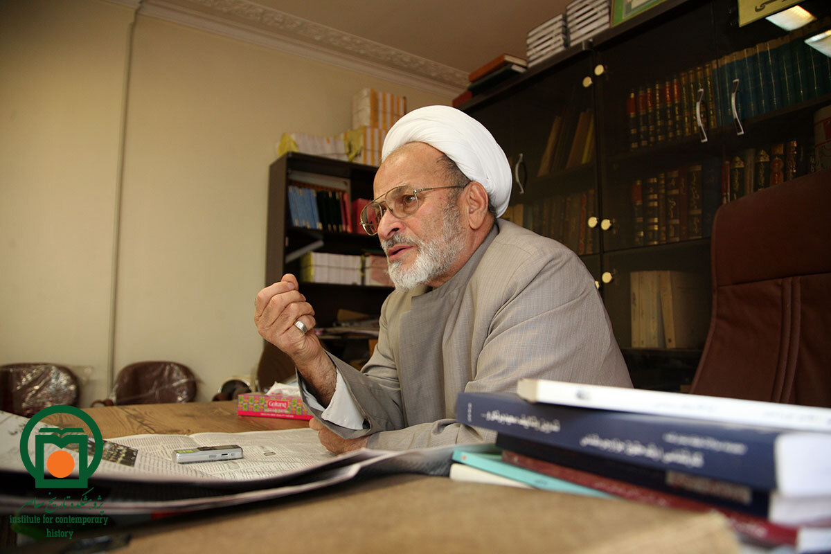 زندهیاد حجتالاسلام والمسلمین جعفر شجونی در گفتوشنود با کتاب ماه تاریخی ـ فرهنگی یادآور، در دفترِ کارِ خویش (سال 1389)