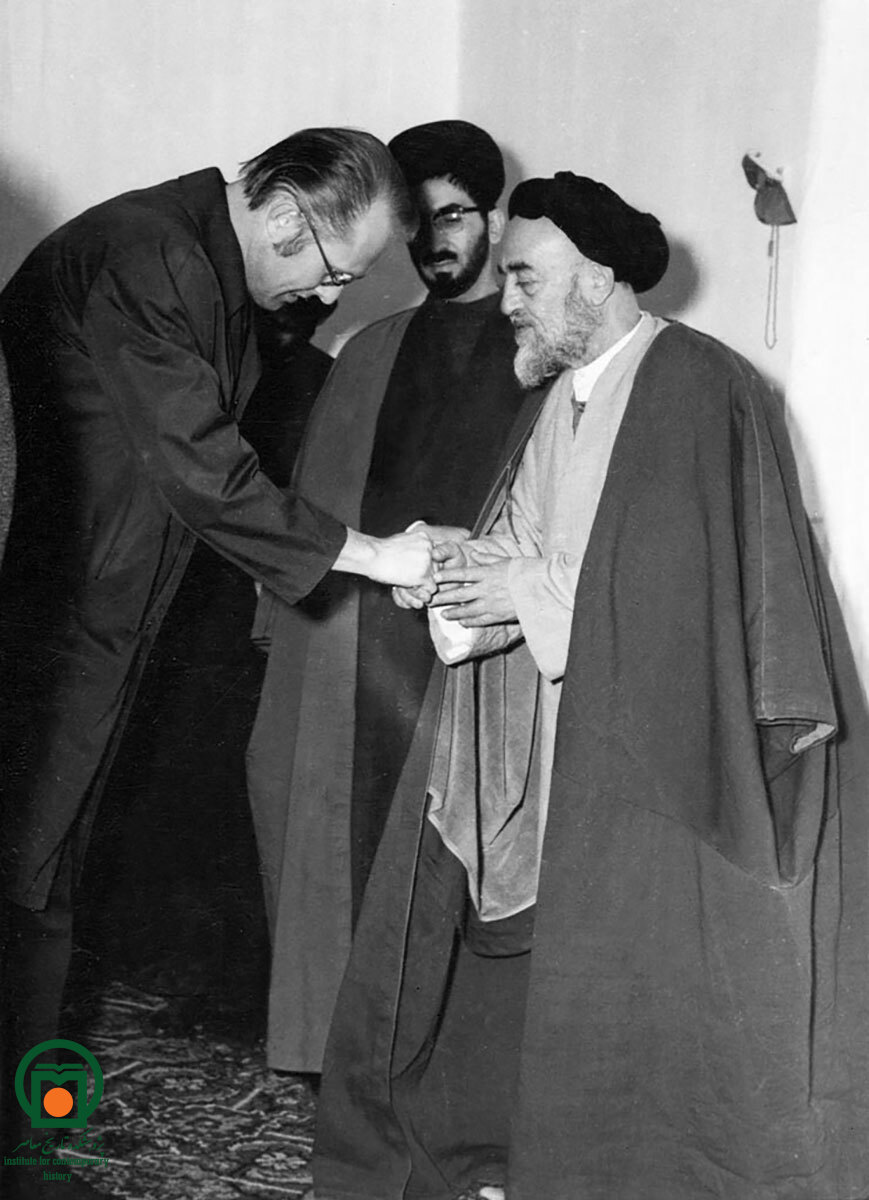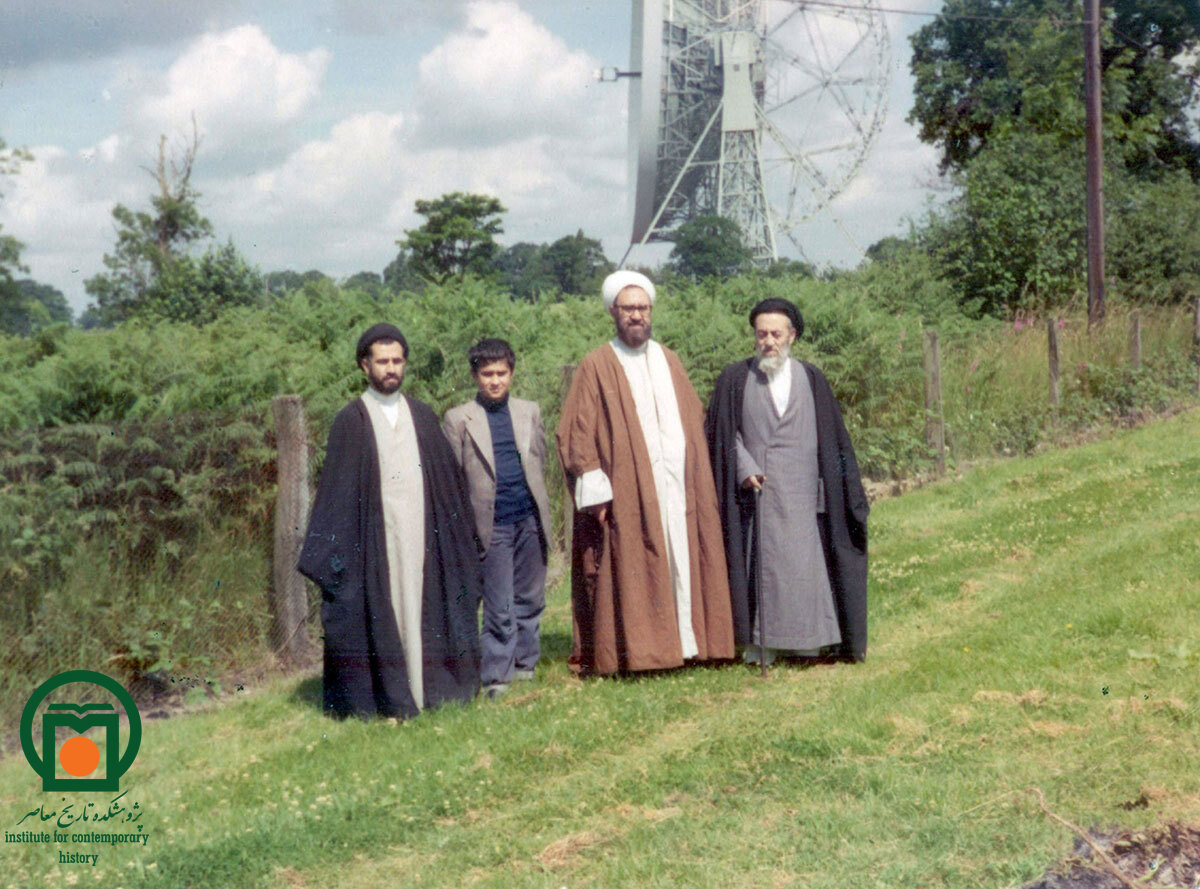 زندهیاد علامه سیدمحمدحسین طباطبائی، در کنار شهید آیتالله مرتضی مطهری، آیتالله سیدحسن طاهری خرم آبادی و فرزندش، در سفر استعلاجی (منچستر انگلستان؛ سال 1356)