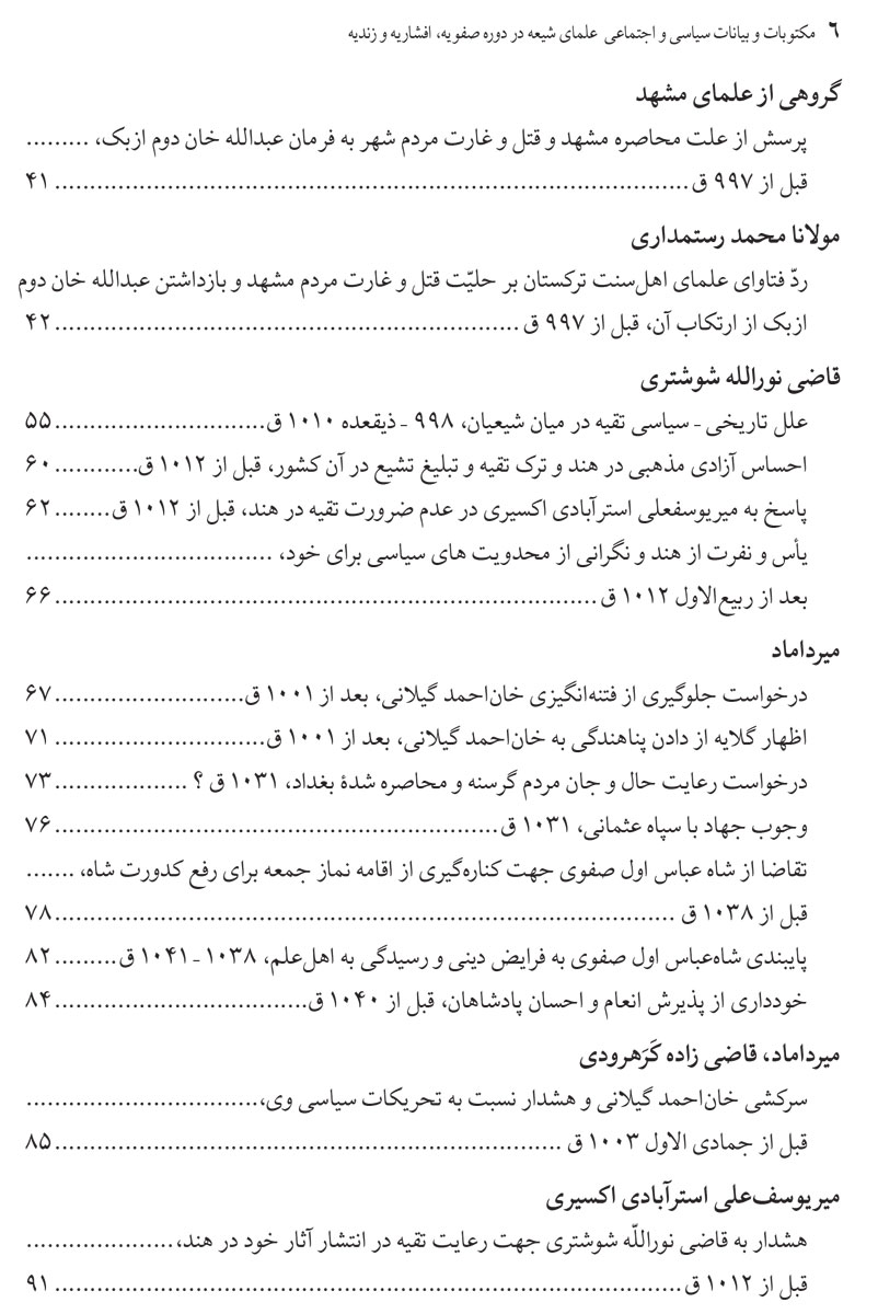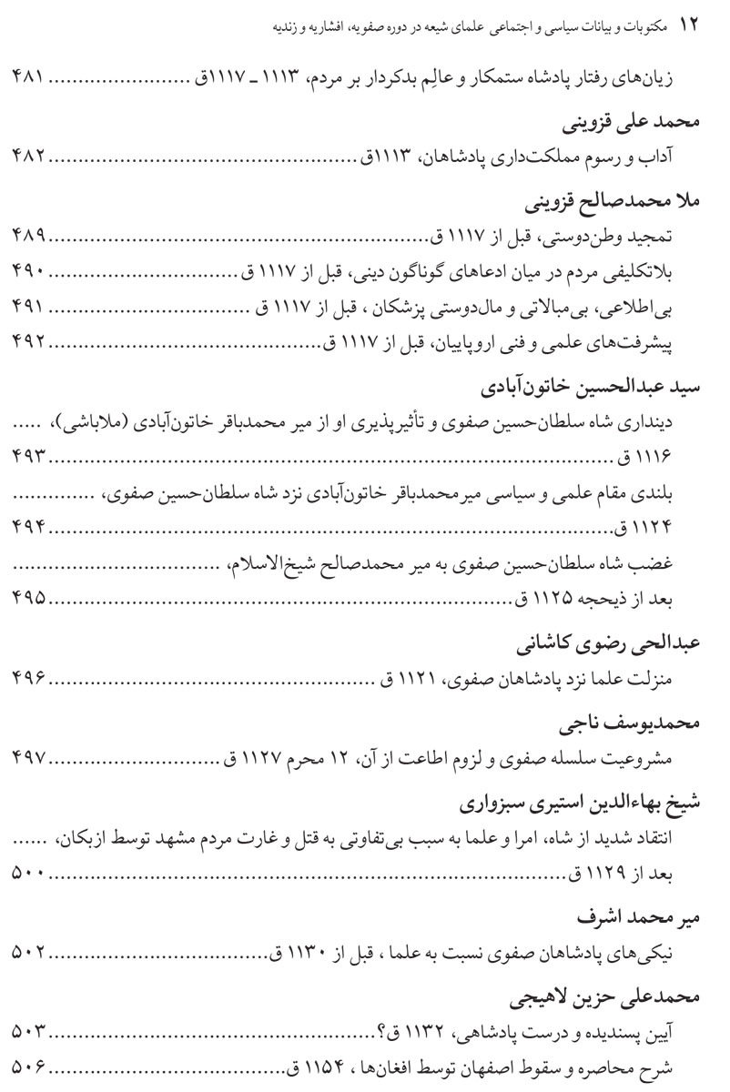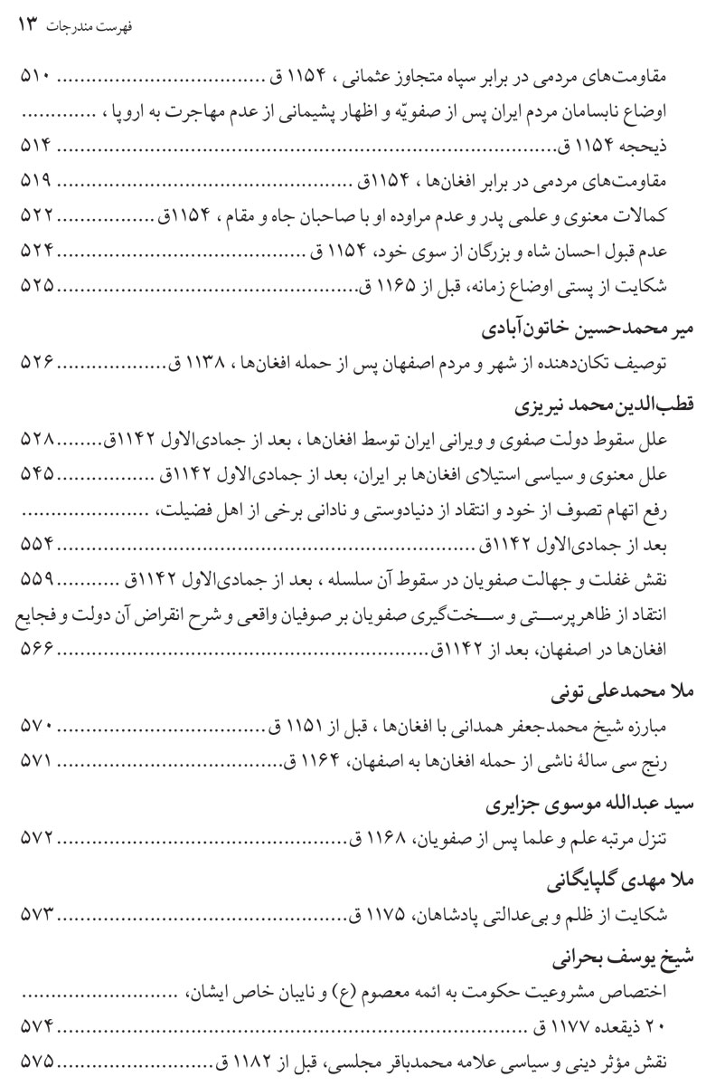 گفتنی است مطالب این کتاب دوره‌های تاریخی صفویه، افشاریه و زندیه را دربر می‌گیرد و بر حسب توالی تاریخی مرتب شده است.