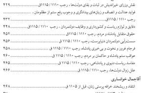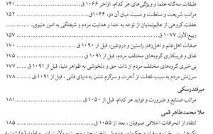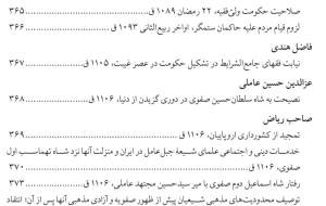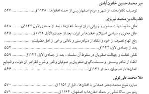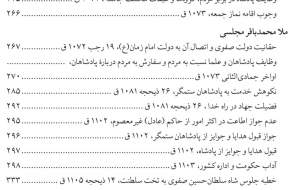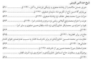 گفتنی است مطالب این کتاب دوره‌های تاریخی صفویه، افشاریه و زندیه را دربر می‌گیرد و بر حسب توالی تاریخی مرتب شده است.