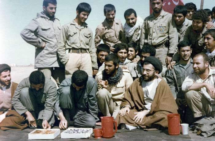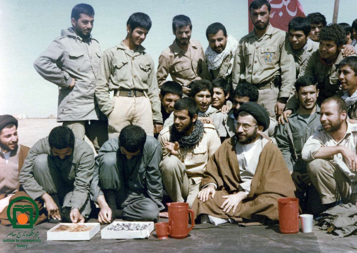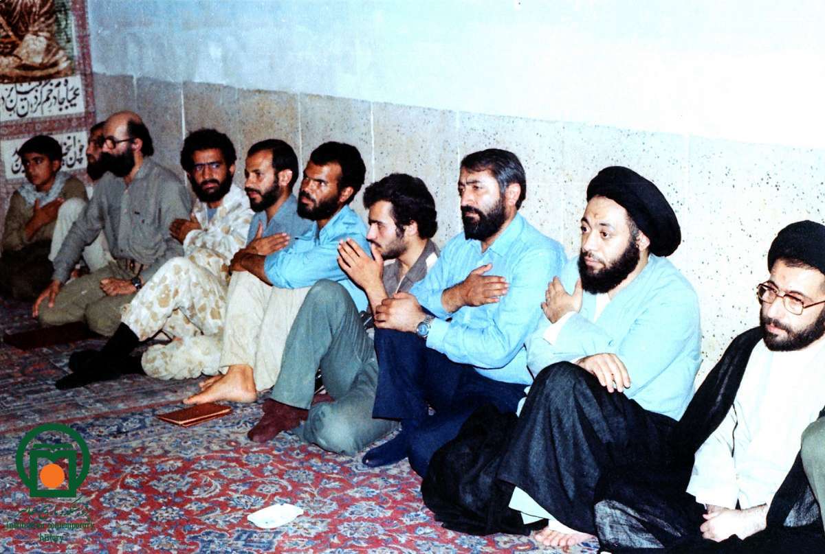زندهیاد آیتالله حاج سیدعلی شفیعی در حلقه جمعی از رزمندگان در دوران دفاع مقدس (دهه 1360)