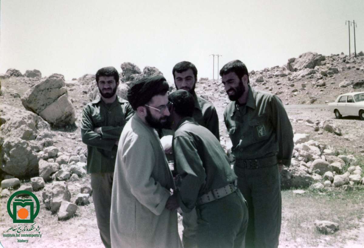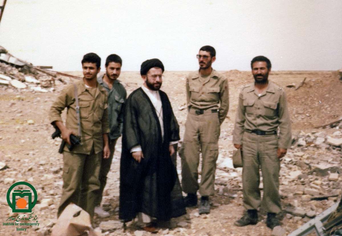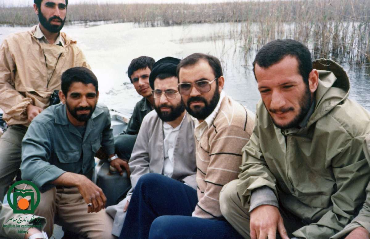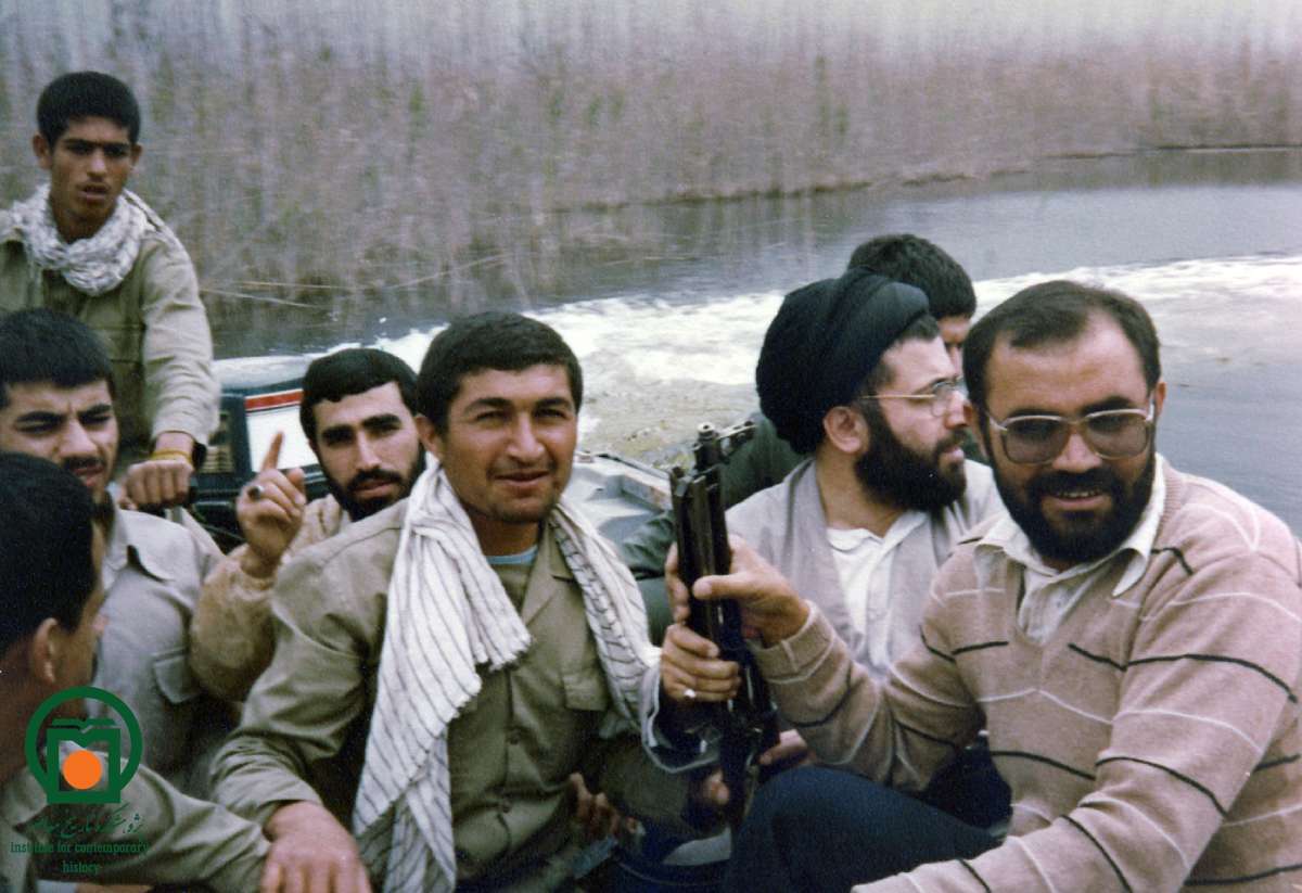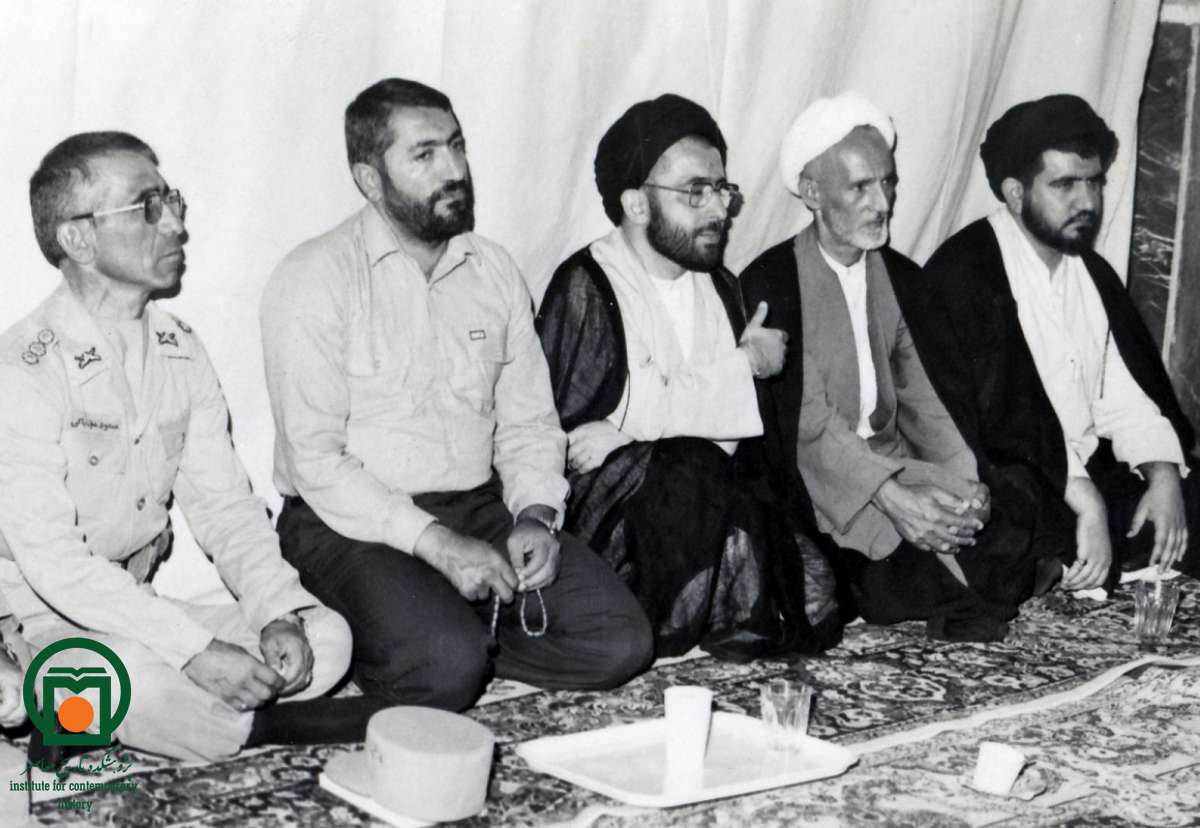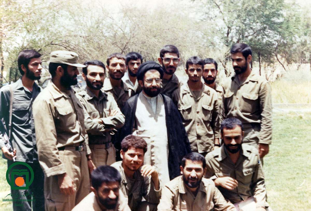 زندهیاد آیتالله حاج سیدعلی شفیعی در کنار شهید سپهبد علی صیاد شیرازی و جمعی از رزمندگان در دوران دفاع مقدس (دهه 1360)