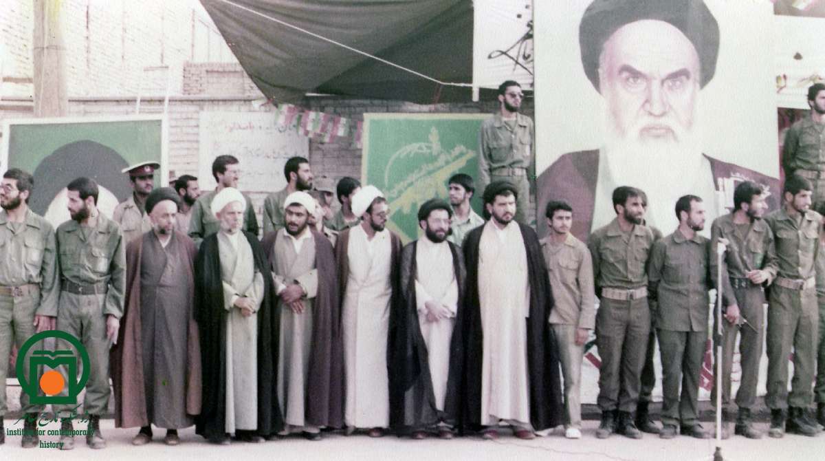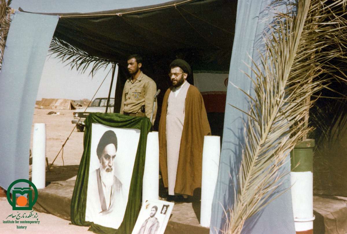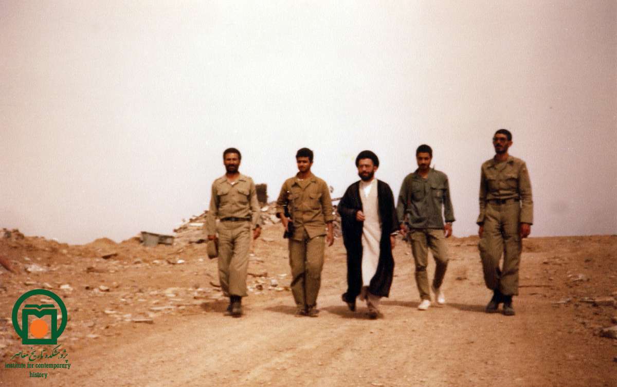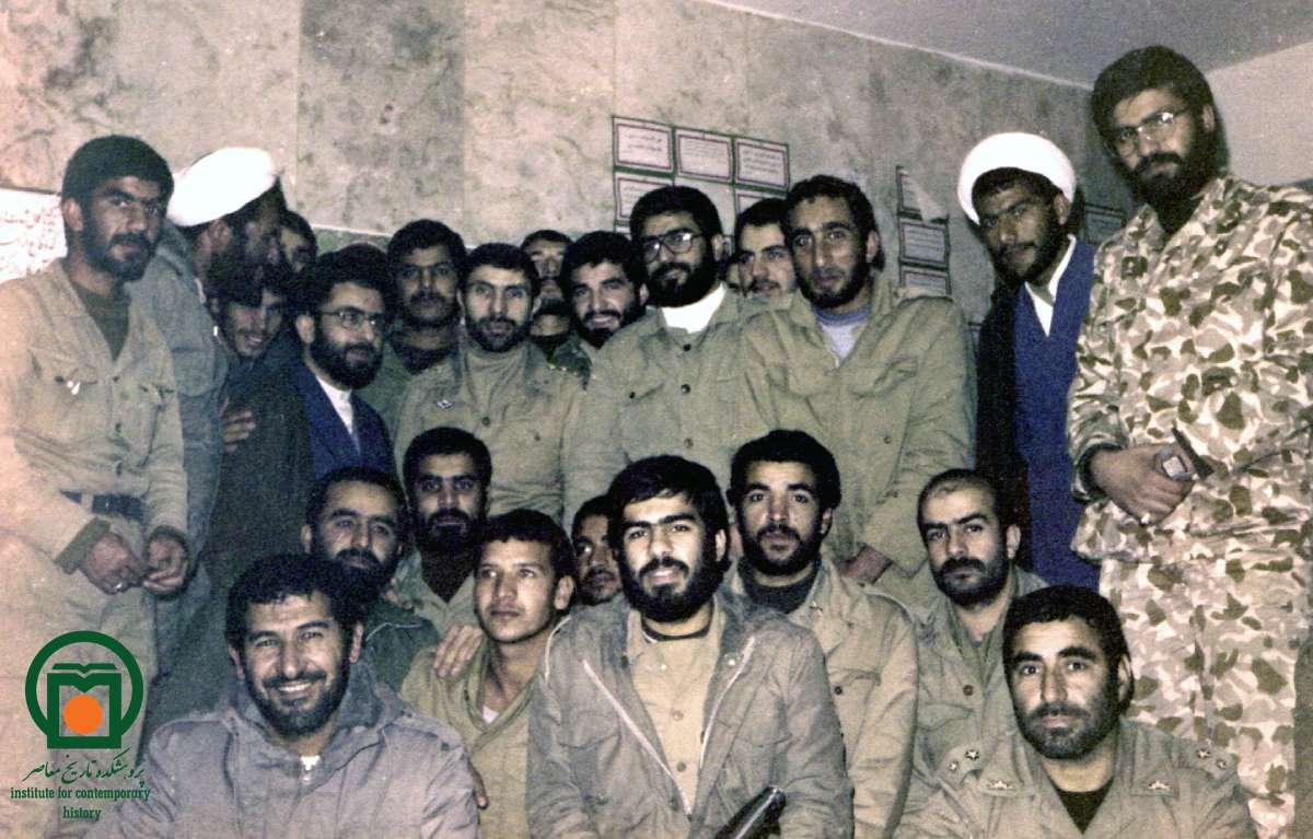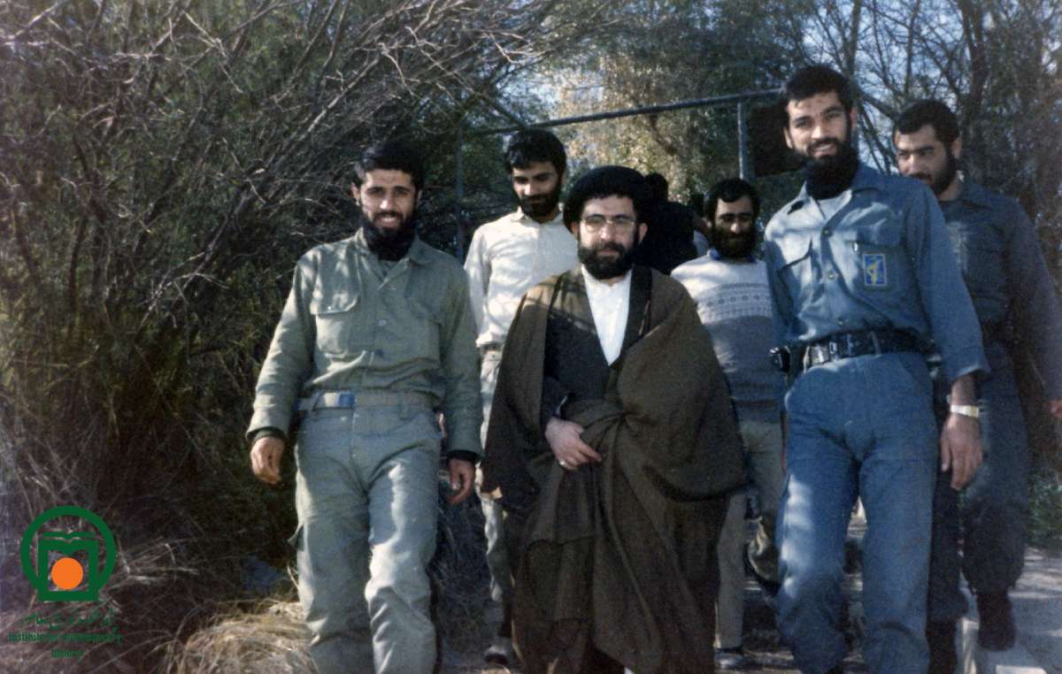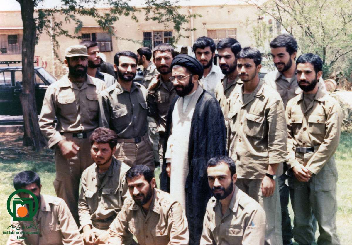 زندهیاد آیتالله حاج سیدعلی شفیعی در کنار شهید سپهبد علی صیاد شیرازی و جمعی از رزمندگان در دوران دفاع مقدس (دهه 1360)