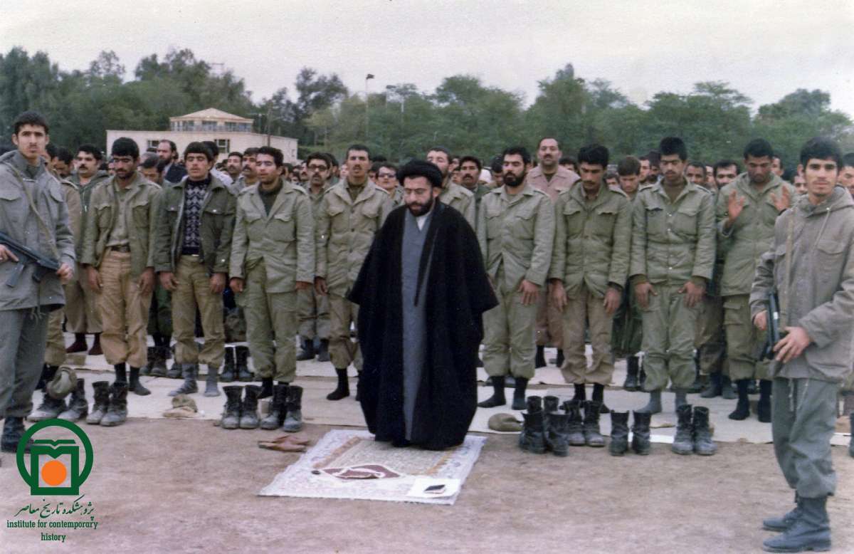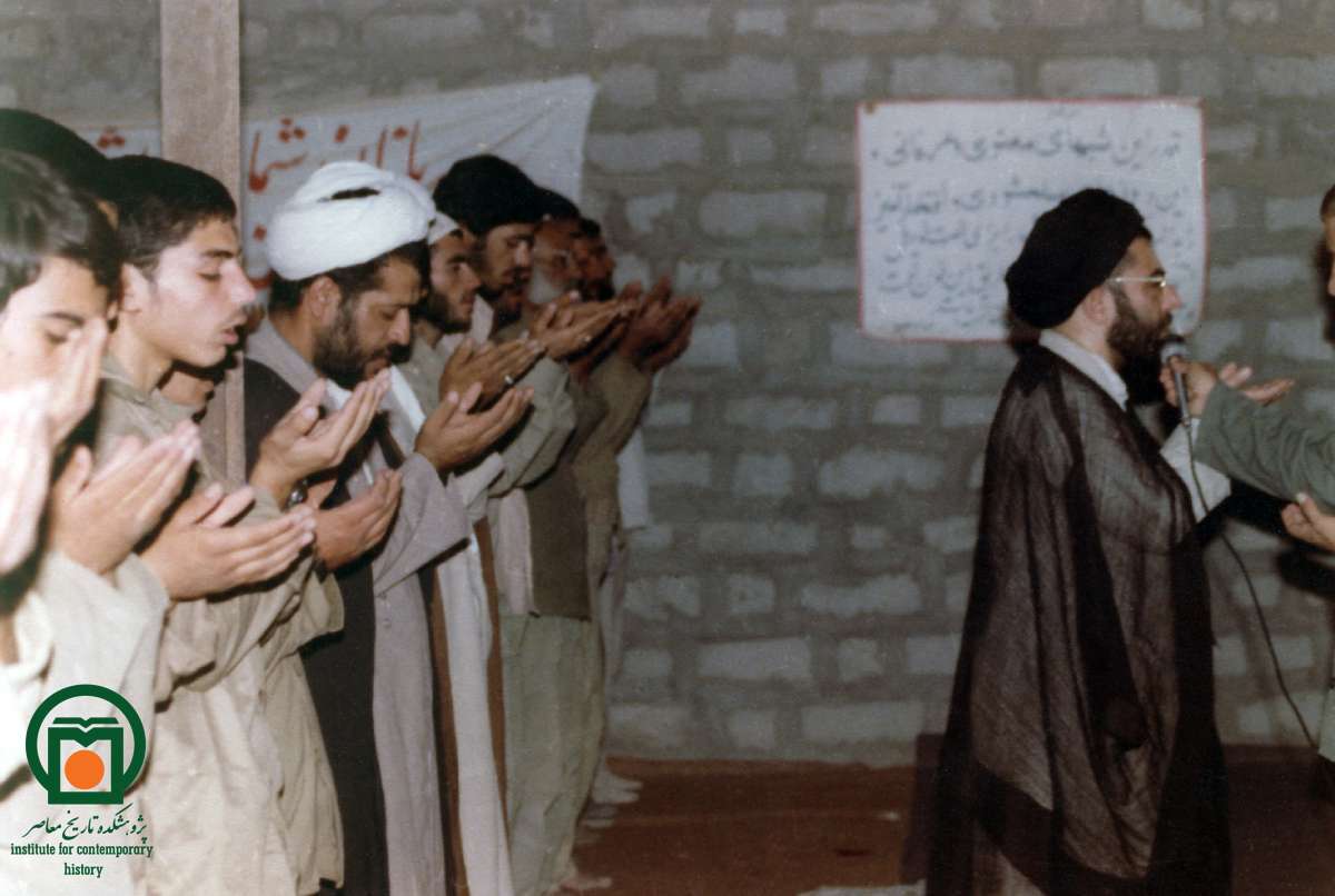 زندهیاد آیتالله حاج سیدعلی شفیعی در حال اقامه جماعت برای جمعی از رزمندگان در دوران دفاع مقدس (دهه 1360)